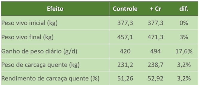 Além disso, também há uma grande melhora no ganho de peso e rendimento de carcaça para animais em engorda a pasto como exemplificado na tabela abaixo. Foi obtido um ganho de carcaça de 7,5Kg a mais para os animais suplementados com o cromo levedura com um rendimento quase 2% superior.