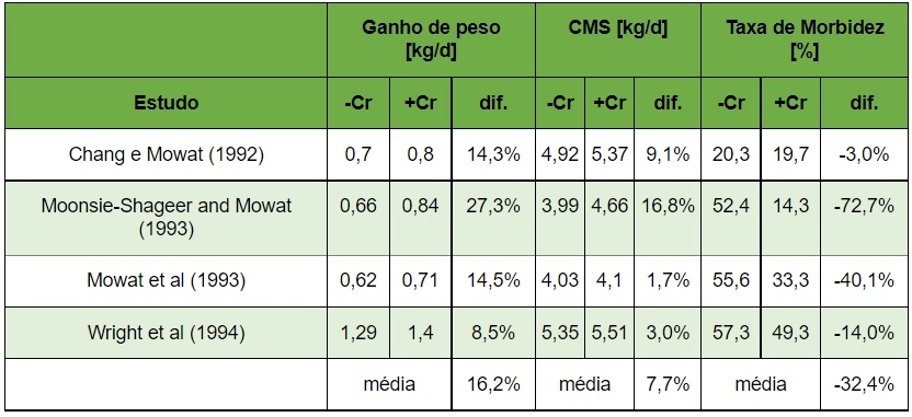 Um estudo9 mostrou que em bezerras, a taxa de morbidade não diferiu entre as suplementadas ou não com cromo, porém, a concentração plasmática de imunoglobulina aumentou quando os animais receberam o mineral na dieta10.
