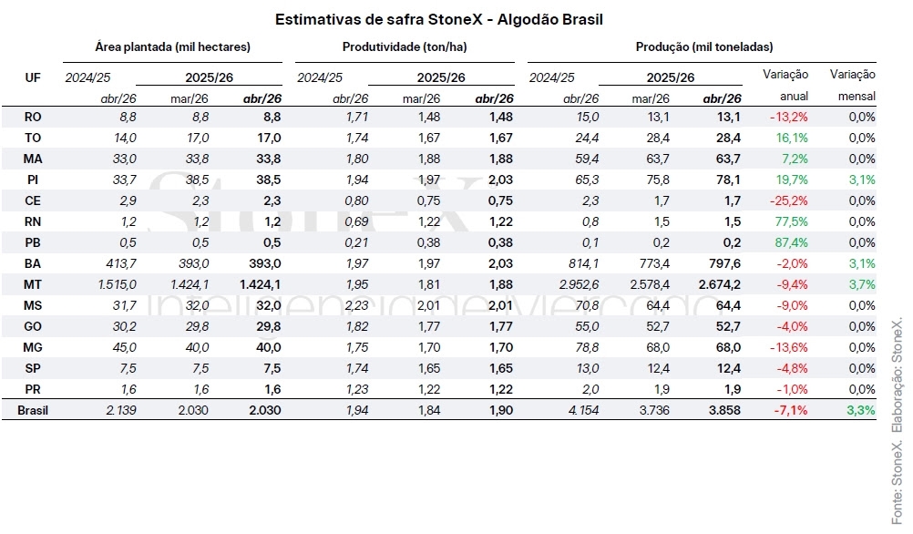 De acordo com a StoneX, na Bahia, os volumes de chuva contribuíram para revisões positivas de produtividade. Mesmo com redução de área plantada, o estado caminha para registrar a segunda maior safra de sua história. Em Mato Grosso, as condições climáticas também favoreceram o desenvolvimento das lavouras, com produtividade estimada em 1,88 tonelada por hectare e produção de 2,7 milhões de toneladas de pluma.