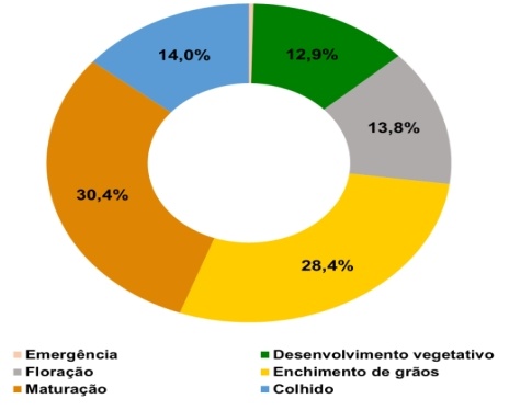 Vale lembrar que, a metade das operações da safra de soja já passou, considerando que, 28,4% está avançando pelo enchimento de grãos, ainda necessitam de chuvas. Há também, pelo menos 30,4% em maturação, que necessitam redução dos volumes de chuva. Já a colheita é registrada em pelo menos 14% das áreas monitoradas pela Conab.