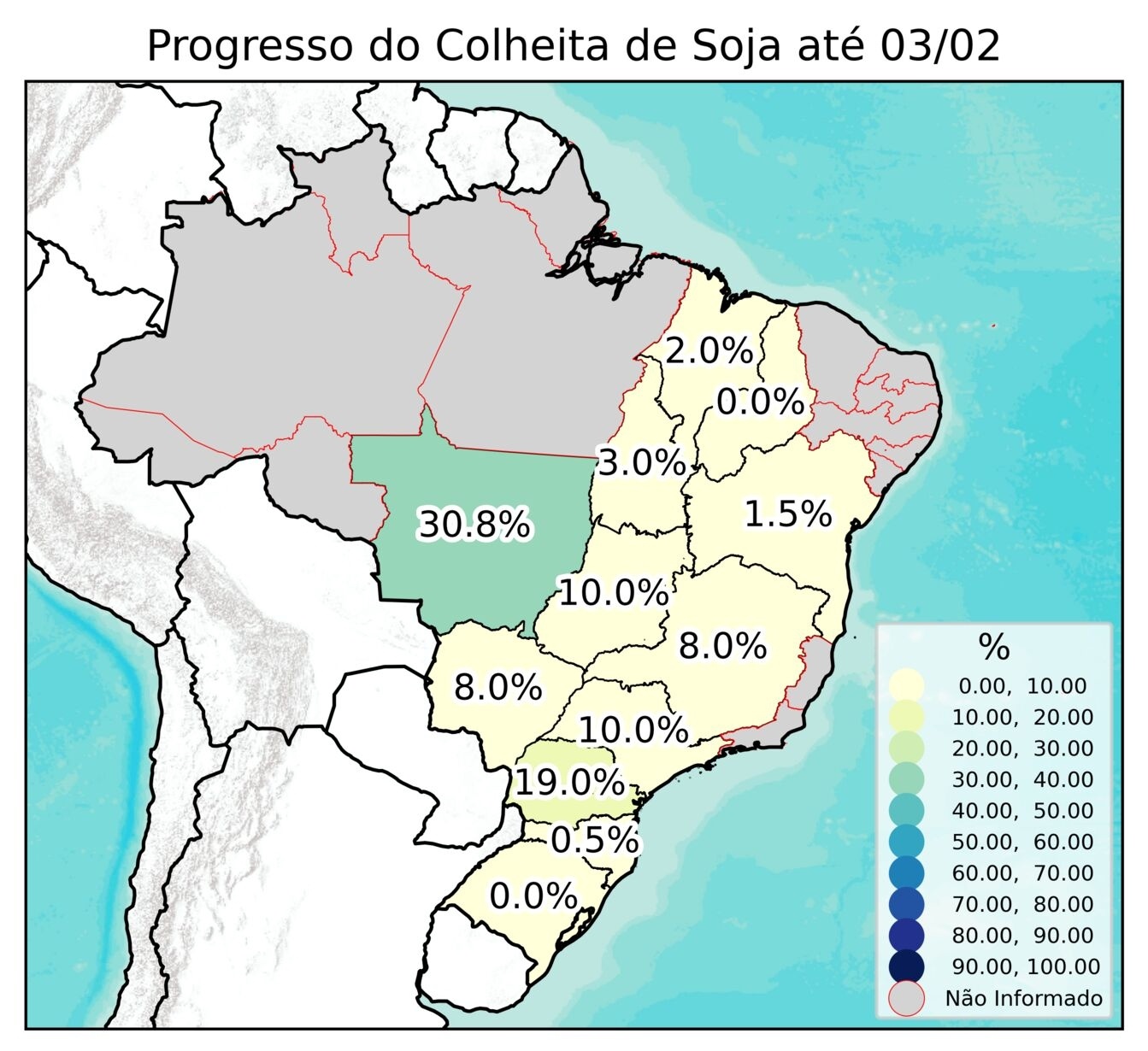 - Mato Grosso do Sul: Dobrou o progresso da colheita, com aumento de 4% (de 4% para 8%), ainda bem acima dos 2% da safra anterior.