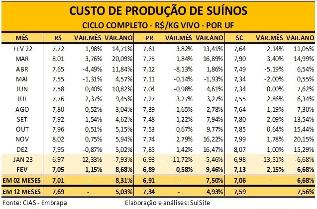 O custo mostra queda em relação ao mesmo período do ano anterior que, entretanto, não foram atualizados e, com isso, perdem efeito comparativo no decorrer de 2023. É certo, no entanto, que os suinocultores seguem amargando prejuizos, visto os preços recebidos na comercialização do suíno seguirem abaixo do custo de criação.