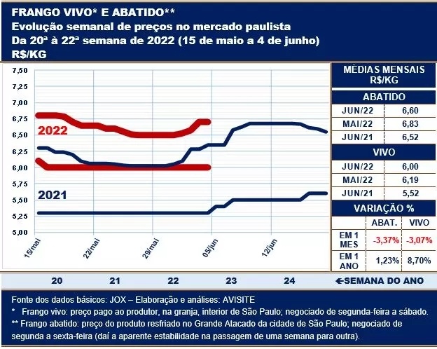 Desempenho do frango (vivo e abatido) na 22ª semana de 2022, passagem de maio para junho