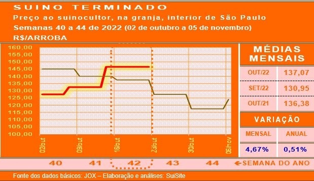 A semana atual (43ª semana de 2022, 23 a 29 de outubro) inicia em ambiente estável e ainda com disponibilidades ajustadas de cevados junto aos suinocultores. Como o período não oferece expectativas positivas no comércio varejista, resta saber se os suinocultores conseguirão sustentar a cotação em alto patamar no decorrer do período.