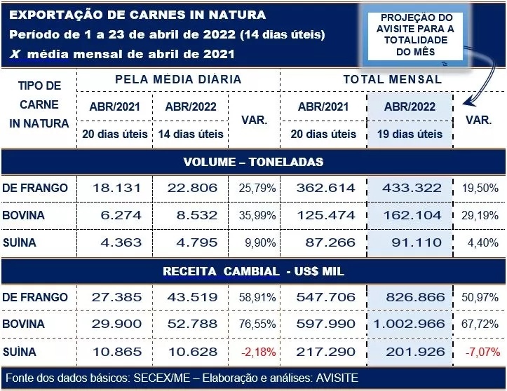 Completados 14 dos 19 dias úteis de abril corrente (um dia útil a menos que há um ano), as exportações das carnes bovina e de frango continuam registrando bons resultados, enquanto as de carne suína voltam a mostrar tendência de aumento no volume embarcado. Comparativamente ao volume médio diário de abril de 2021, os embarques médios do corrente mês registram aumento de, praticamente, 36% para a carne bovina, de quase 26% para a carne de frango e de, aproximadamente, 10% para a carne suína.