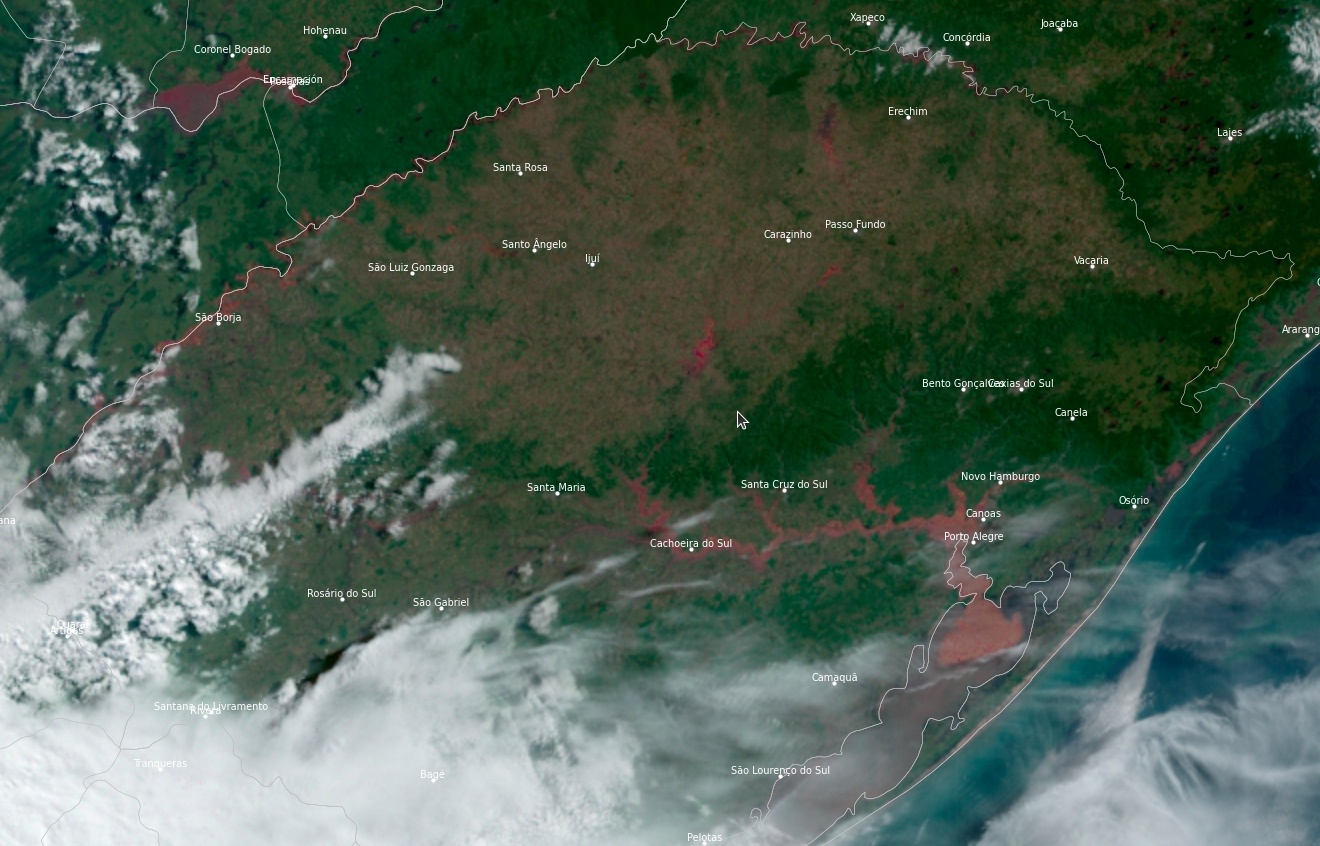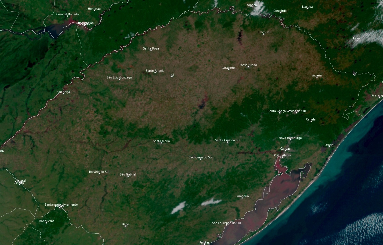 Com o tempo firme em boa parte do Rio Grande do Sul, os satélites conseguem visualizar as dimensões do avanço dos rios sobre as regiões afetadas, pelas enchentes da última semana.