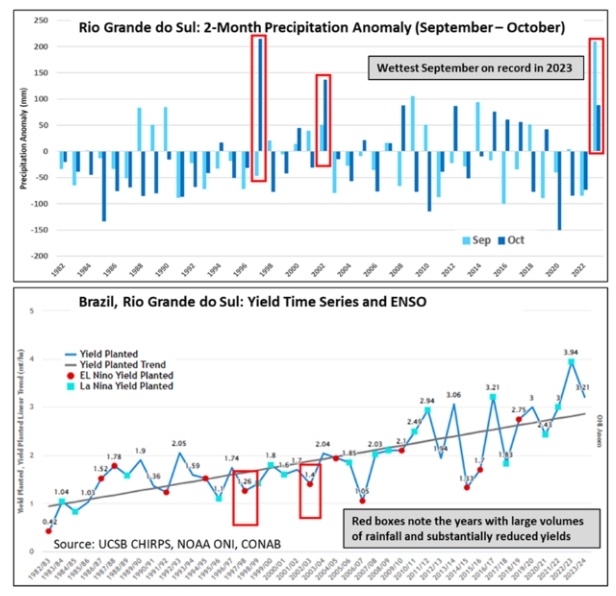 A SEAB/DERAL, agência estadual de relatórios do Paraná, reduziu sua estimativa de rendimento do trigo para 2,73 toneladas por hectare no final de outubro. Os rendimentos no Rio Grande do Sul são ainda menores, já que este estado sofreu com volumes de chuva muito maiores que o Paraná nos últimos dois meses.