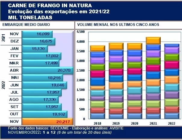 Ainda que venham a sofrer alguma diluição no decorrer do período, os números iniciais da SECEX/ME sobre as exportações de carne de frango in natura de novembro corrente são auspiciosos. Nos primeiros oito dias do mês foram embarcadas 161.733 toneladas do produto, volume decorrente de embarques médios de, aproximadamente, 20.217 toneladas diárias, segundo melhor resultado de toda a história das exportações. Com esse resultado, transcorridos apenas 40% do mês (oito de um total de 20 dias úteis de novembro), o volume exportado representa quase 53% das pouco mais de 305 mil toneladas de um ano atrás.
