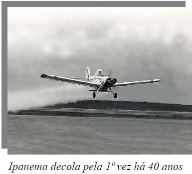 A Embraer está comemorando 40 anos do primeiro vôo da aeronave agrícola Ipanema. O projeto do avião começou no final da década de 1960, sob demanda do Ministério da Agricultura, que solicitou ao Instituto de Pesquisas e Desenvolvimento (IPD) a concepção de uma aeronave agrícola para substituir os modelos importados. O projeto tornou-se realidade com a criação da Embraer, em 1969. Hoje, o Ipanema é líder na aviação agrícola brasileira, com mais de 1.100 unidades entregues e 75% da frota em operação.