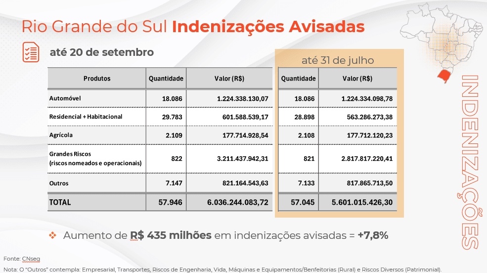 Até agosto, 183 mortes foram confirmadas, e mais de 2,4 milhões de pessoas foram afetadas de alguma forma, com 478 municípios gaúchos registrando inundações, deslizamentos e bloqueios de estradas. O volume total de pedidos de indenizações de seguros relacionados à enchente no Rio Grande do Sul cresceu quase 8% entre 31 de junho e 20 de setembro. O quarto levantamento elaborado pela CNseg junto às suas associadas mostra que os pedidos de indenizações dos clientes junto às seguradoras superaram R$ 6,0 bilhões, uma adição de R$ 435 milhões ao divulgado em 2 de agosto, quando os registros somaram R$ 5,6 bilhões. A Confederação Nacional das Seguradoras (CNseg) classificou o evento como o maior sinistro do setor de seguros no Brasil, com mais de R$ 1,6 bilhão em pedidos de indenização.