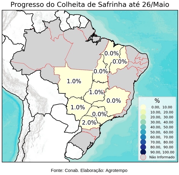 - Minas Gerais: A colheita permaneceu em 0,0%, sem mudança em relação à semana anterior e ao mesmo período do ano anterior.