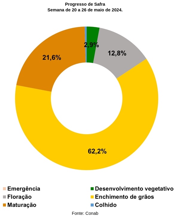 A maior parte das lavouras, representando 62,2%, está na fase de enchimento de grãos. Em seguida, 21,6%% das lavouras encontram-se na fase de maturação. Nesta fase, as plantas completam seu ciclo de desenvolvimento, e os grãos atingem a maturidade fisiológica. A colheita geralmente se inicia logo após esta etapa, quando o teor de umidade dos grãos atinge níveis ideais.