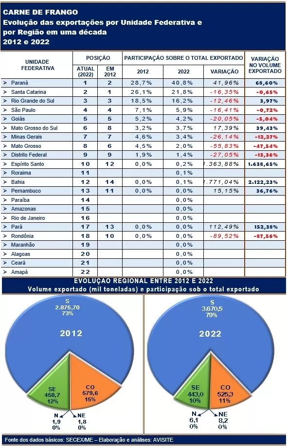 Uma retrospectiva às exportações de carne de frango de 2012 aponta que, então, 14 Unidades Federativas (UFs) brasileiras participaram do processo. Como em 2022 esse número subiu para 22 UFs, verifica-se aí aumento de, quase, 60%. Embora significativo, esse aumento não mudou o panorama do setor. Pois ainda que o volume exportado também tenha aumentado (perto de 20%), o Centro-Sul continua respondendo por mais de 99% das exportações brasileiras de carne de frango.