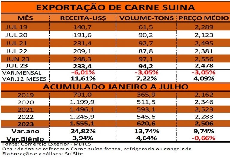 As primeiras informações divulgadas sobre o fechamento das exportações de carne suína no decorrer de julho apontam para pequeno retrocesso mensal, em volume e receita.
