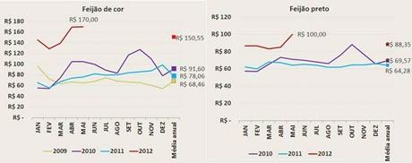Ao contrário do primeiro quadrimestre de 2011 os preços médios do feijão de cor no estado do Paraná ultrapassaram o custo de produção sendo a média dos cinco primeiros meses deste ano (R$ 150,55) quase duas vezes superior à média anual de 2011 (R$ 78,06). O preço médio recebido pelo produtor atingiu o preço de R$ 170,00 por saca no mês de maio segundo a Secretaria da Agricultura e do Abastecimento do Paraná- SEAB.