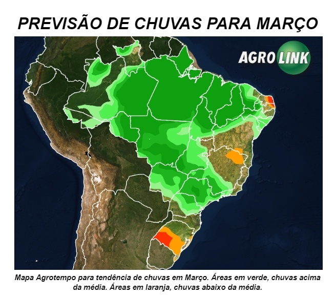 Como mencionado, o padrão do La-Niña deve permancer atuando no decorrer das próximas semanas, englobando também o mês de Março. Assim, de acordo com a Projeção Agrotempo, as chuvas devem ficar acima da média entre o Paraná, sul de Minas Gerais, praticamente todas as áreas do Centro-Oeste, Tocantins, Maranhão, Piauí e Ceará.