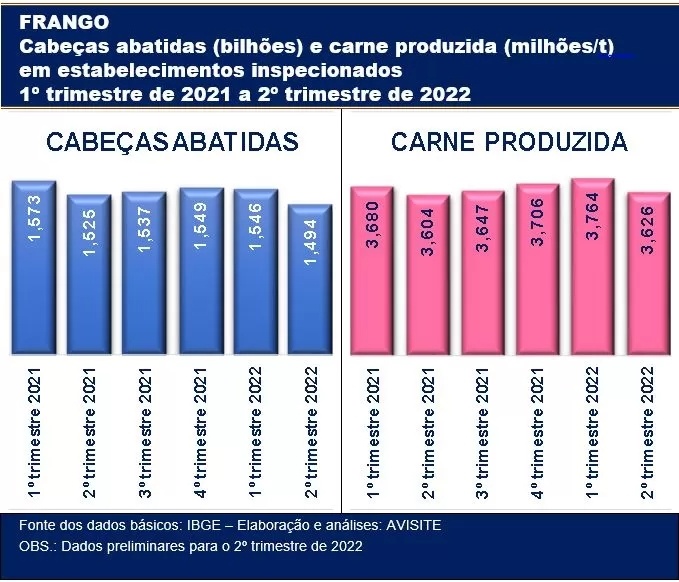 Embora os dados sejam preliminares, já é possível considerar que o número de cabeças de frango abatidas no segundo trimestre de 2022 correspondeu ao menor nível trimestral em um ano e meio