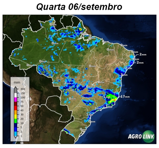 A quarta-feira (06/09) terá como destaque a atuação de uma frente fria na parcela central do Brasil. Este sistema provoca chuvas irregulares e passageiras em áreas do Centro-Oeste e Sudeste do país.