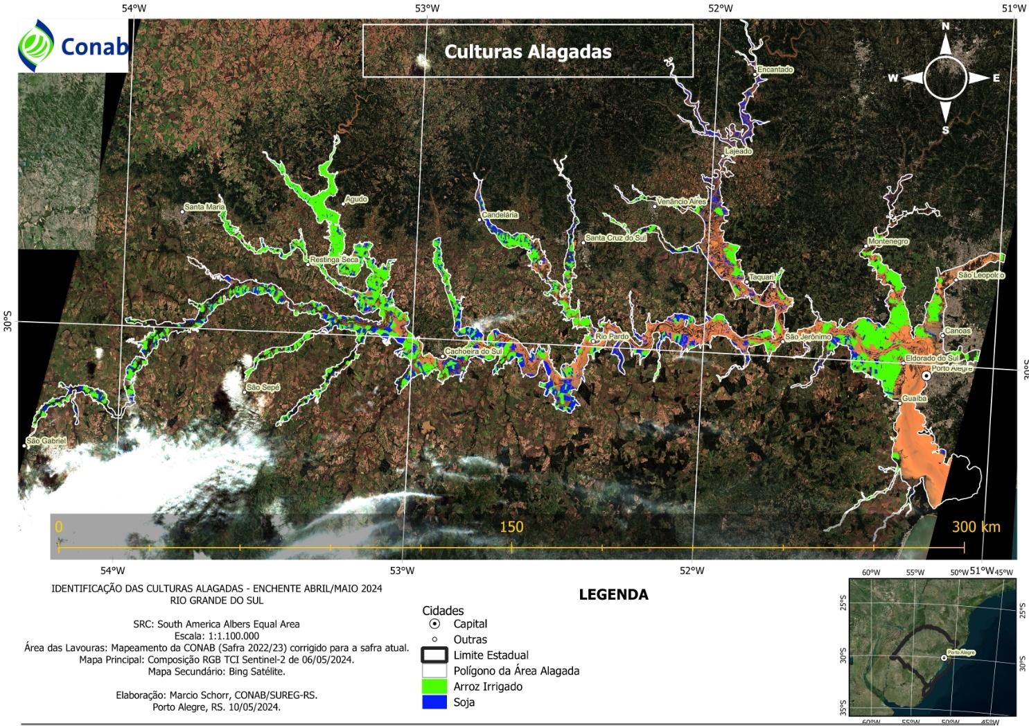 Identificação das áreas com arroz irrigado e soja afetadas pelas enchentes de abril/maio de 2024 no Rio Grande do Sul. Fonte: Conab