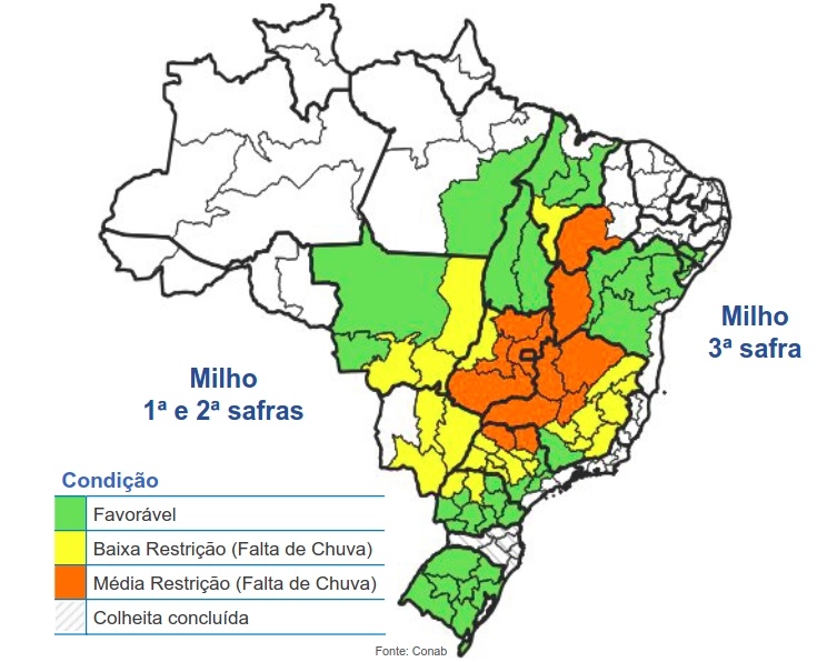 As lavouras mais afetadas são as lavouras de milho segunda safra (safrinha) entre o noroeste de São Paulo, Triângulo, Oeste e Norte de Minas, praticamente todo o estado de Goiás, Oeste da Bahia e sul do Piauí. Nestas áreas a Conab projeta condições de média restrição hídrica, devido à falta de chuvas. Já em áreas do sul e leste de Mato Grosso, Mato Grosso do Sul, oeste de Goiás, noroeste do Paraná, oeste de São Paulo, leste de Minas e sul do Maranhão, as restrições são consideradas “baixas”. Contudo, essa condição persiste há várias semanas.
