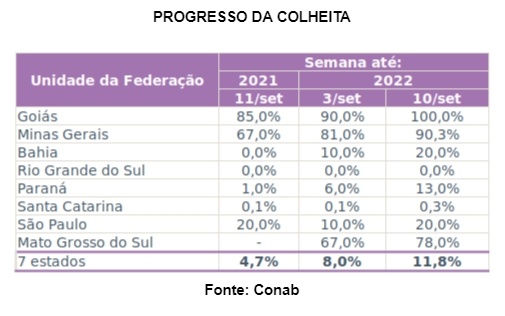 Em Santa Catarina, as lavouras estão em boas condições e majoritariamente em desenvolvimento vegetativo. Em Mato Grosso do Sul, a colheita tem sido favorecida pelo clima predominantemente seco, mantendo a qualidade dos grãos produzidos. Em Minas Gerais, as áreas de sequeiro encontram-se colhidas, faltando algumas áreas irrigadas.