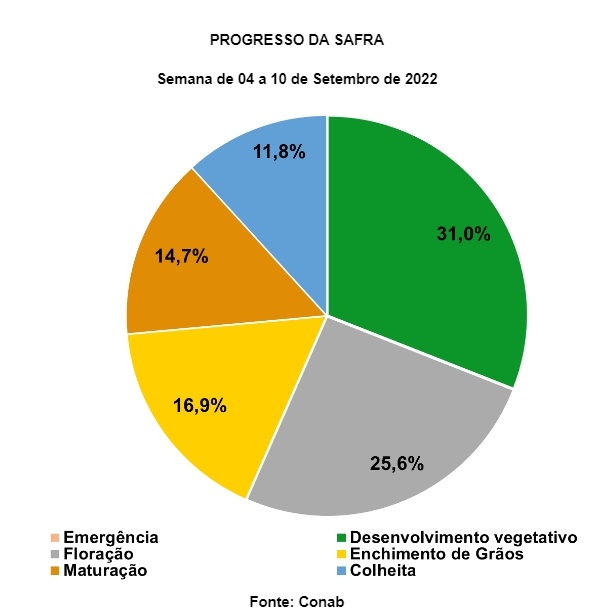 Progresso: 11.8% Colhido; 31.0% Desenvolvimento Vegetativo; 25.6% Floração; 16.9% Enchimento de Grãos; 14.7% Maturação;