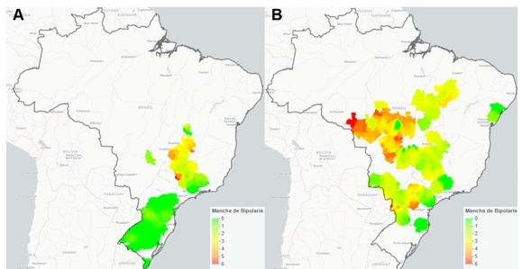Figura 4. Mapa de ocorrência e severidade do Complexo de Bipolaris na safra de Verão (A) e 2° Safra (B) 2024.