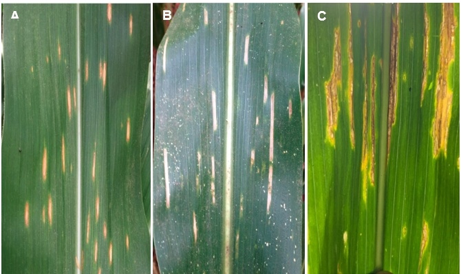 Figura 2. Diferença de sintomas de Mancha de Bipolaris (A), mancha de Cercospora (B) e Estria Bacteriana (C) (Fotos: Willian Zancan)