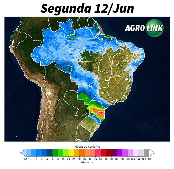 Na segunda-feira (12/06) o tempo terá a grande influência da frente fria que se formou no decorrer do final de semana. Este sistema de chuvas está recebendo o forte suporte de ar quente e úmido proveniente da floresta tropical, o que resulta em um corredor de umidade passando pelos estados do Centro-Oeste e grande volume de chuva na região Sul. Entre Santa Catarina e Paraná, os acumulados devem superar os 50 mm no decorrer desta segunda-feira. O corredor de instabilidades também provoca chuvas no Mato Grosso do Sul e Mato Grosso. Apesar do avanço da frente fria, as instabilidades no Sudeste ficam confinadas ao extremo sul.