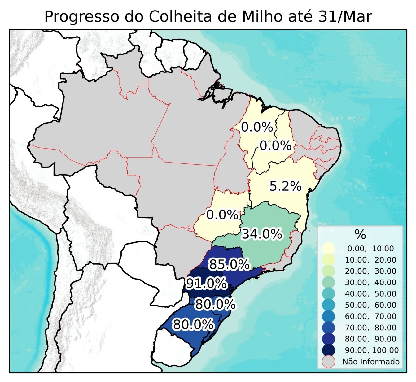 No Piauí, a situação é favorável, com a cultura agrícola se desenvolvendo sob boas condições climáticas. O Paraná, praticamente finalizando as operações de colheita, está experimentando uma fase de tempo seco, que tem facilitado os avanços nas operações. Em Santa Catarina, a colheita está progredindo, com rendimentos variáveis.