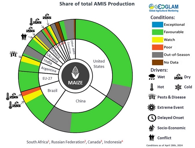 Representação gráfica das condições do milho nos principais produtores do mundo. Fonte: GEOGLAM.