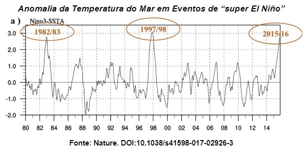 Diversos artigos científicos sugerem que o aquecimento global pode intensificar os eventos de El Niño, tornando-os mais fortes e duradouros. Esses eventos mais intensos, chamados de Super El Niños, geram extremos climáticos globais que estão associados a anomalias excepcionais de temperatura, eventos extremos e de precipitação em muitas áreas terrestres.