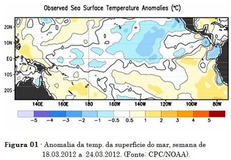 “O fenômeno climático “La Niña”, que tem influenciado o nosso clima nos últimos meses, vem diminuindo sua intensidade rapidamente”, lembra. As temperaturas das águas superficiais do Oceano Pacífico Equatorial, vem passado por uma rápida mudança de padrão nos últimos dois meses, passando de águas mais frias para um aumento gradual das temperaturas das águas superficiais naquela região. Observam-se águas mais frias a oeste do Oceano Pacífico Equatorial, enquanto próximo a costa oeste da América do Sul predomínio de águas mais quentes (01 a 02°C acima da média).