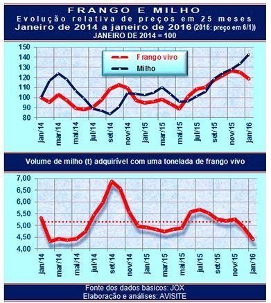 A análise da evolução dos preços do frango vivo e do milho desde janeiro de 2014 mostra que, após “casamento” com duração de um ano (evolução de preços muito similar entre dezembro de 2014 e novembro de 2015), há agora um “divórcio” entre os dois produtos.
