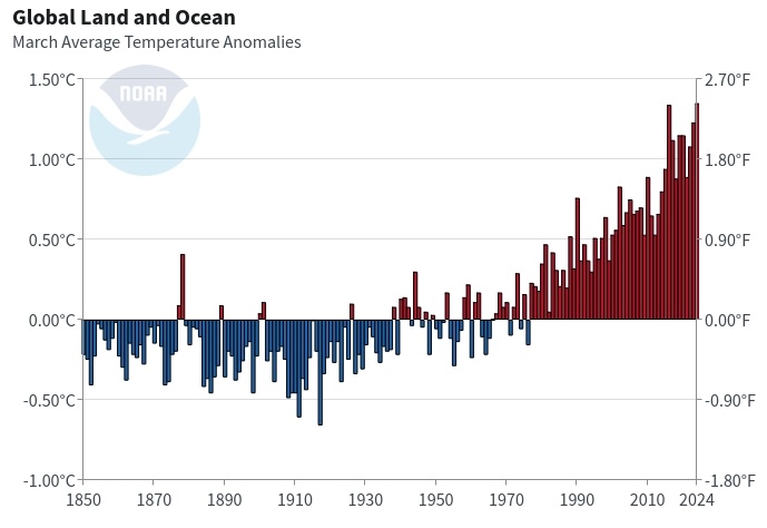 Março de 2024 entra para a história com recordes de temperaturas, vindo de uma sequência de 10 meses consecutivos. - Foto: NOAA