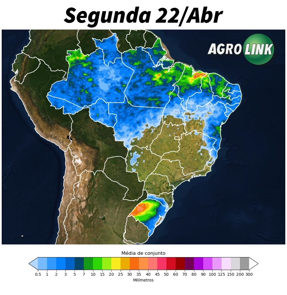 Por outro lado, a aproximação de uma nova rodada de instabilidades pelo sul do Brasil, traz chuvas volumosas em áreas do Rio Grande do Sul, interrompendo as operações de colheita da soja e do arroz. Ao mesmo tempo, a massa de ar frio vai perdendo intensidade, embora o amanhecer ainda tenha temperaturas amenas.