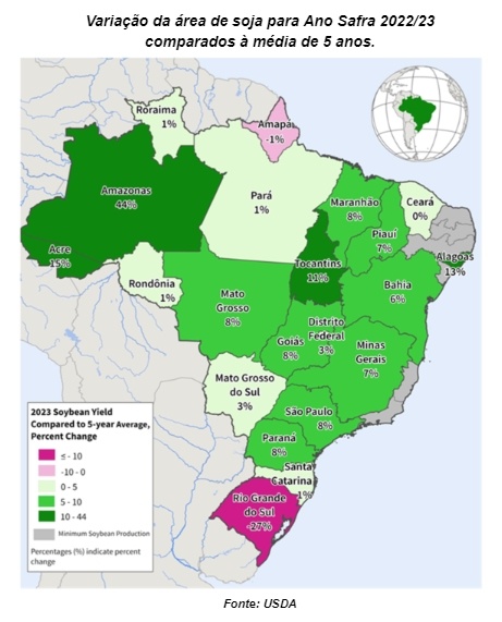 A produção de soja do Brasil deve atingir um recorde no ano-safra 2022/23, de acordo com as últimas estimativas do Departamento de Agricultura dos Estados Unidos (USDA), com estimativas de atingir 154,0 milhões de toneladas, um aumento de 1,0 mi ton em relação às projeções do mês passado e 24,0 mi ton (18%) em relação ao último ano.
