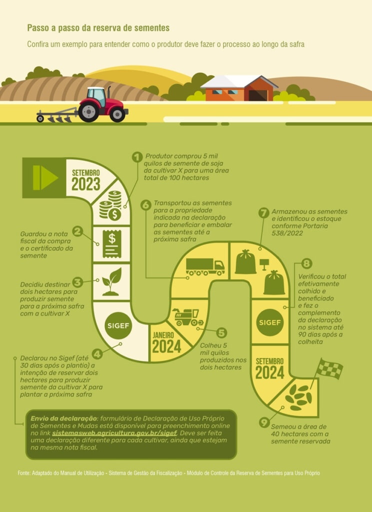 O Ministério da Agricultura e Pecuária (Mapa) publicou a Portaria 538/2022, que regula, dentre outros temas, a produção e a utilização de sementes. A medida atualiza normas para o uso próprio de sementes salvas e mudas a partir de 1º de março deste ano. A Declaração de Uso Próprio é obrigatória, garantindo o bom funcionamento do Sistema Nacional de Sementes e Mudas (SNSM) disposto pela Lei 10.711/2003.