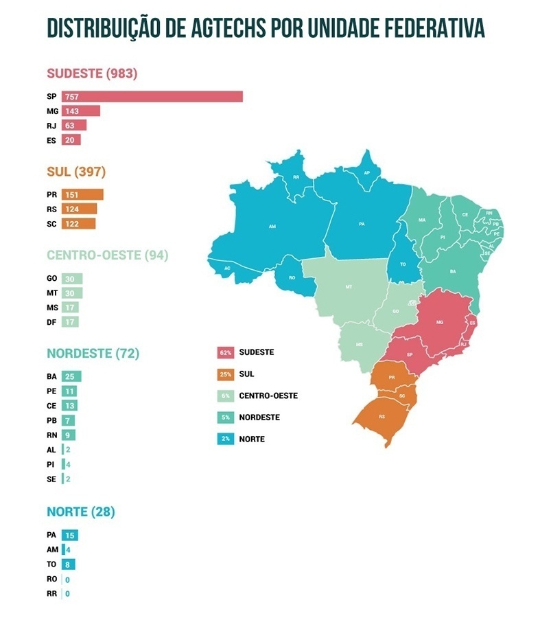 O percentual por regiões ficou o seguinte: Sudeste, 62,4% (983); Sul, 25,2% (397); Centro-Oeste, 6,1% (96); Nordeste, 4,6% (72); e Norte, 1,7% (26), representando um aumento no número mapeado de 84,6% das agtechs nordestinas e de 53% no número de startups da Região Norte em comparação com o Radar Agtech Brasil 2019. Além disso, os cinco estados com mais startups do agro são: São Paulo (757), Paraná (151), Minas Gerais (143), Rio Grande do Sul (124) e Santa Catarina (122).