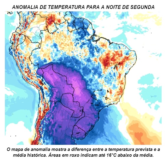 Esses ventos vão impulsionar a massa de ar frio pelo interior do continente, derrubando as temperaturas na Argentina e Uruguai já no domingo (30). Durante a madrugada de segunda (31), o ar frio avança pelo Rio Grande do Sul, Paraguai e sul da Bolívia. Até a noite de segunda, as temperaturas entram em queda em toda a região Sul, Centro-Oeste e no estado de Rondônia no norte do País.