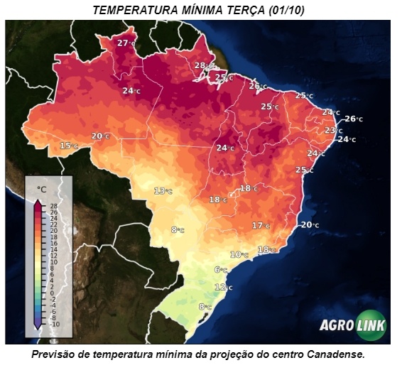 Agora os maiores impactos desta onda de frio no setor agro refere-se, claro, às baixas temperaturas e a possibilidade de geadas. As geadas estão previstas para ocorrer a partir de terça-feira (01/11), de forma esparsa sobre os estados da região sul.