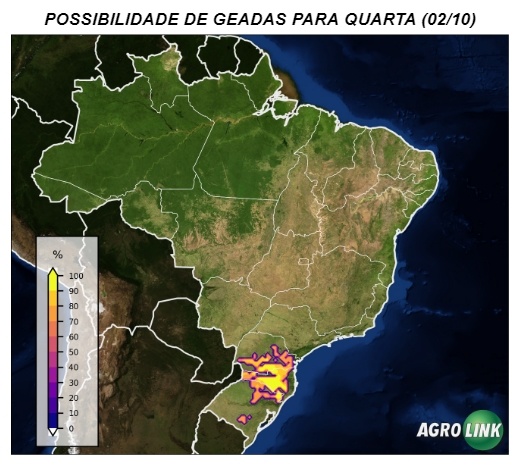 Na quarta-feira (02), as condições de geadas são mais elevadas com a possibilidade do registro de geadas mais fortes e amplas, sobre o norte do Rio Grande do Sul, Santa Catarina, e Paraná. Essa condição se repete na quinta (03).