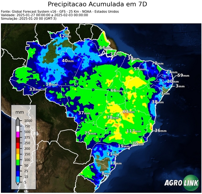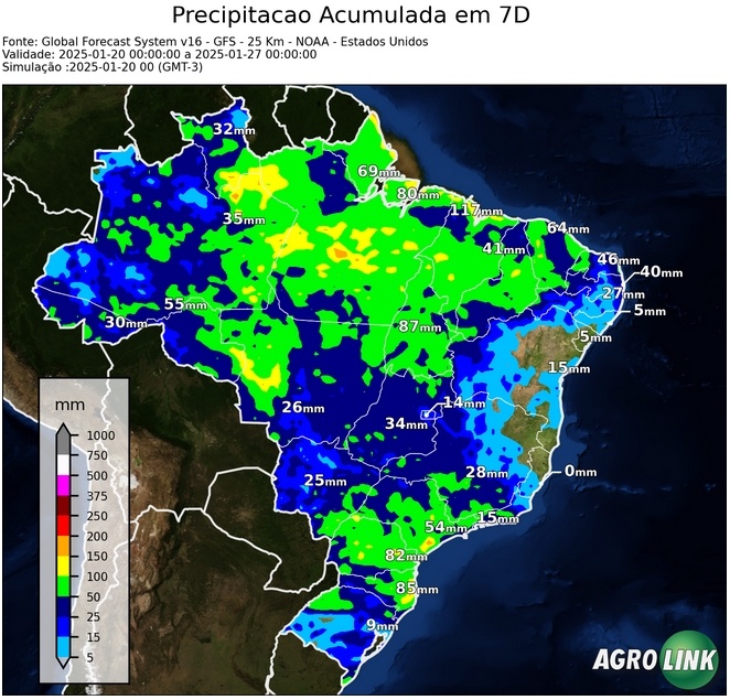 Previsão de chuvas para a semana de 20 a 27 de janeiro de 2025. Fonte: Agrolink.