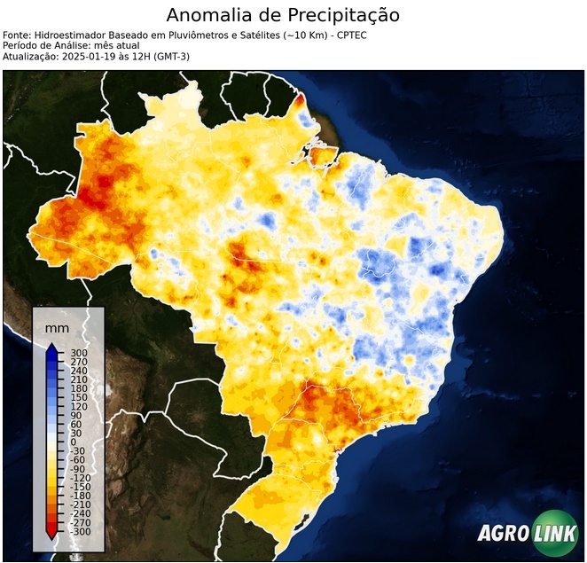 Mapa da diferença entre o que seria esperado e o que aconteceu entre 1 a 19 de Janeiro de 2025. Fonte: Agrotempo.