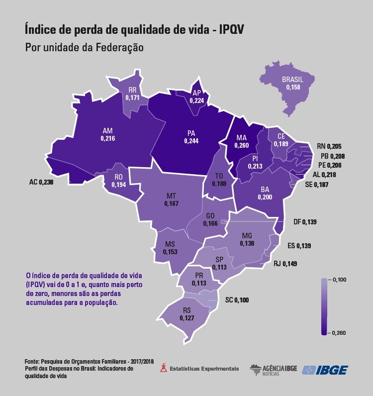 O Norte (0,225) e o Nordeste (0,209) foram as regiões que apresentaram as maiores perdas de qualidade de vida. Já o Sul (0,115) e o Sudeste (0,127) tiveram o IPQV abaixo do nacional. O do Centro-Oeste foi de 0,159.