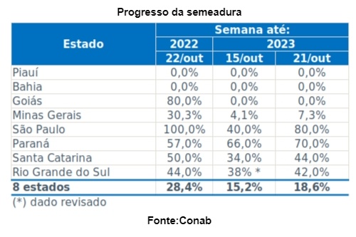 Goías apresenta um atraso significativo, com 0% de semeadura até 21 de outubro, em contraste com os 80% da safra passada. Minas Gerais, embora mostre um aumento modesto, permanece distante dos números da safra anterior, com 7,3% de plantio comparado aos 30,3% anteriores.