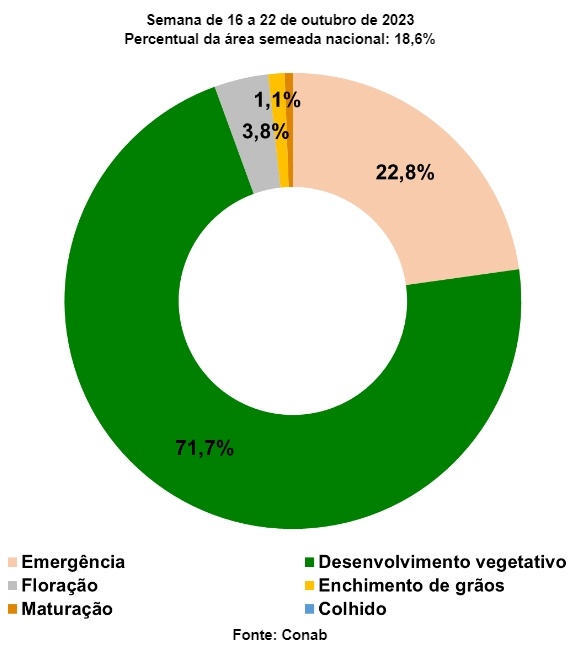 No âmbito nacional, o desenvolvimento inicial do feijão é promissor. Até o momento, 18,6% da produção nacional foi semeada, com 71,7% em desenvolvimento vegetativo. Apesar disso, o plantio permanece abaixo dos números da safra anterior, representando desafios.