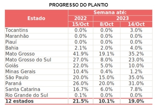 O ritmo do plantio da safra 2023/24 vem sendo limitado pelas chuvas extremamente irregulares. Contudo, a variação é pequena se comparado com o mesmo período da temporada anterior, onde 21.5% das lavouras estavam semeadas, contra 19% em 14 de Outubro de 2023. Ritmo que vem puxado pelos índices registrados em São Paulo e Paraná.