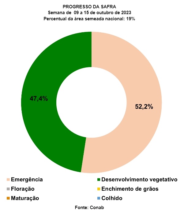 Santa Catarina registrou um aumento de 6% para 7.8% no plantio. Em Tocantins, onde a semeadura foi antecipada em algumas áreas devido às boas precipitações, o plantio atingiu 3%.