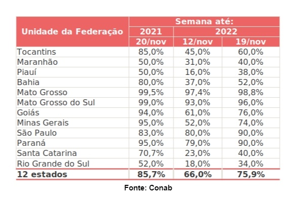 Em Minas Gerais, o avanço da semeadura foi favorecido com o retorno das chuvas. Assim como no MATOPIBA, o plantio evolui em todas regiões, devido à regularização das precipitações.